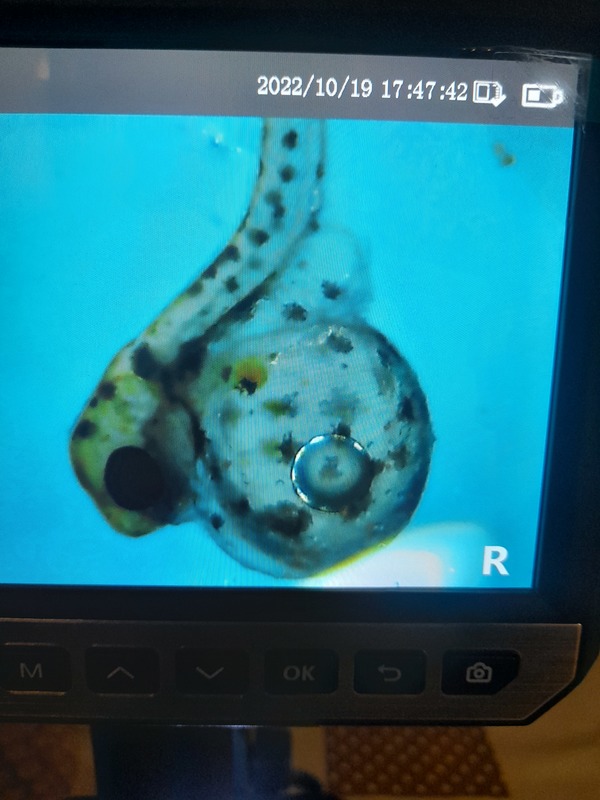 J'ai un œuf d'aphyosemion australe qui est entré en diapause à partir de novembre pendant plusieurs semaines puis a commencé à se développer de manière étrange, le corps dehors de son œuf mais toujours rattaché à celui ci de l'intérieur. Au microscope on observe bien le circulement des fluides entre l'oeuf et l'alevin.
