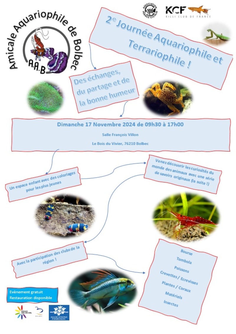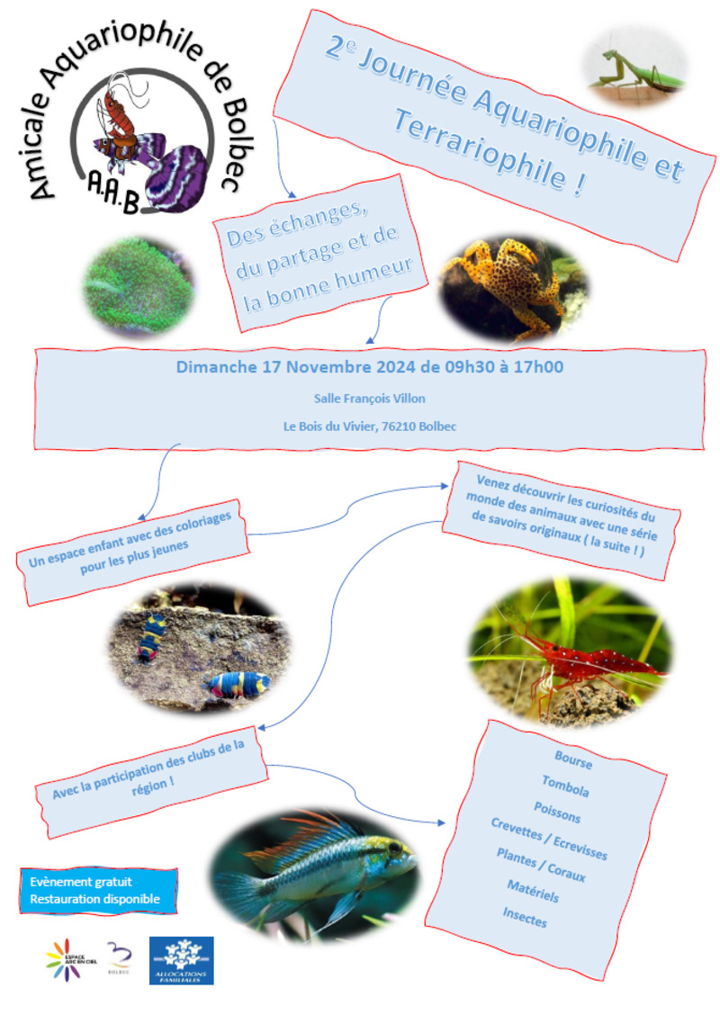 Je suis organisateur de bourse en Normandie (76). J'ai entre autres organisé la partie bourse et tombola de Pont L'évêque 2023 ( Trouville sur Mer et Afv) et la 1ere bourse de Bolbec 2023 ( Amical aquariophile de Bolbec).