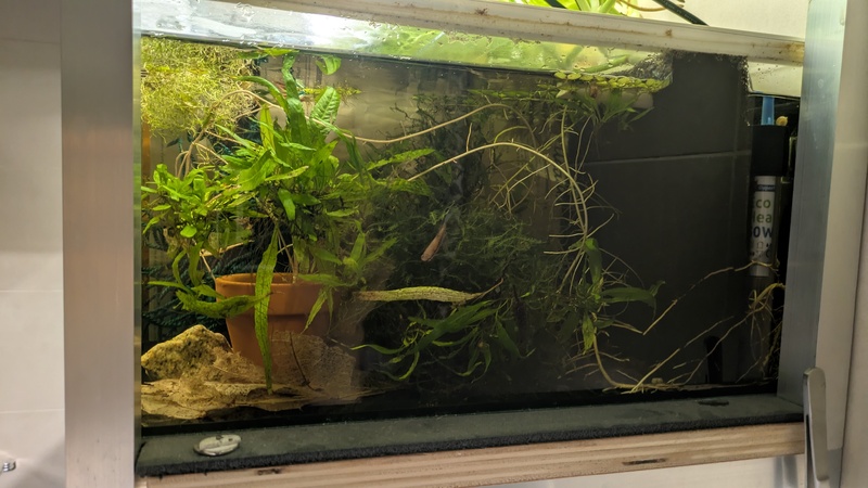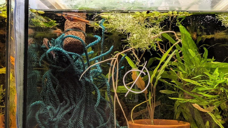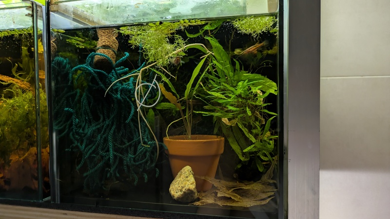 Ils sont dans un bac de 25 * 40cm sur 20cm de haut = 20L. Bac avec chauffage réglé à 25°C. Au début il étaient dans un eau à 300 µS/cm, là j'ai progressivement abaissé à 130 µS/cm. Je n'ai pas remarqué de changement de comportement que ce soit avant ou après les changements d'eau, le chauffage... Je les vois un peu pondre, c'est rare, c'est tout autant dans le mop que dans la mousse de java. Mais je ne trouve jamais rien derrière. Je pense qu'ils chassent très activement les œufs.
